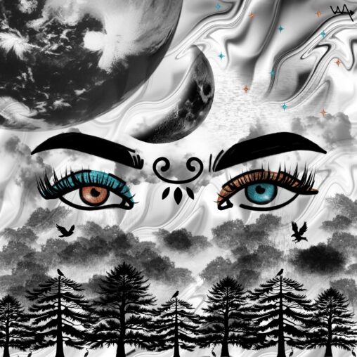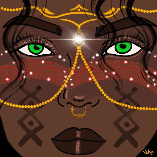 ✏️Celle qui voit évoque une figure initiatique, gardienne d’un savoir ancien et d’une énergie intérieure maîtrisée. Le regard vert, symbole de vie, de lucidité et d’intuition, semble traverser le spectateur, invitant à une introspection silencieuse.