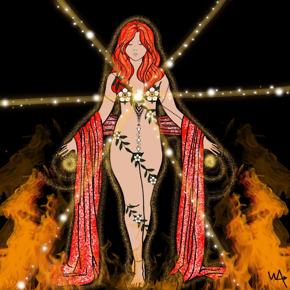 Sa chevelure flamboyante et les tissus rouges qui prolongent ses bras évoquent le feu, la passion et la force vitale. Autour d’elle, des étincelles dorées et des flammes dansent, comme si l’énergie de transformation était en pleine activation.